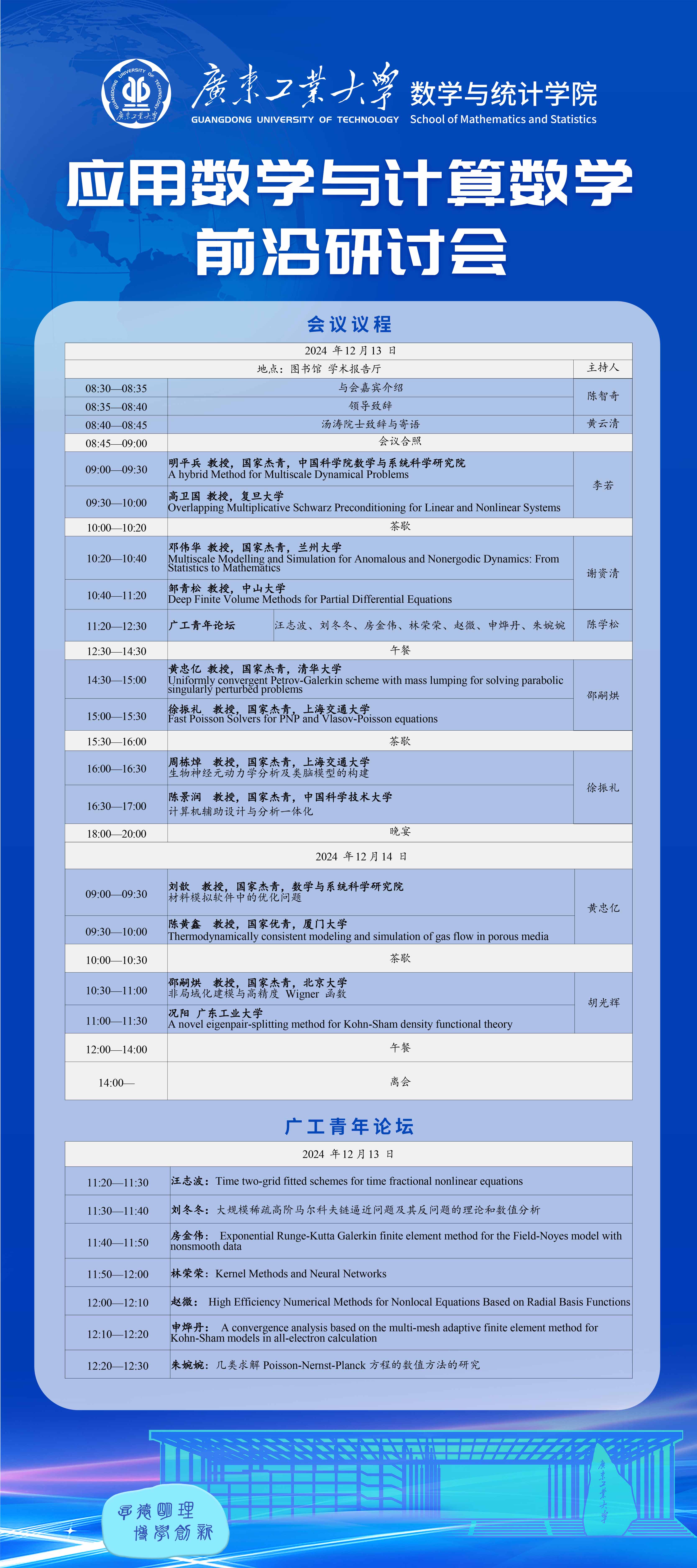 本次研讨会旨在加强应用数学和计算数学领域的学术交流,深化对理论、方法及其应用的理解,同时探索学术前沿并激发未来的研究合作。会议特邀请应用数学和计算数学领域11位国家杰青,2位国家优青等专家来我校指导,围绕各自的前沿课题与最新研究进展进行专题报告和深入交流。会议还特别设立了“广工青年论坛”,为青年学者提供展示学术成果、交流研究经验的平台,促进多学科、多领域的思想碰撞与合作。